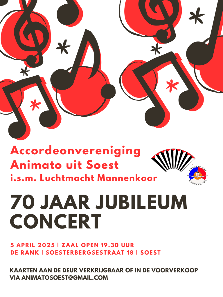 Ter gelegenheid van ons 70-jarig bestaan geven we een speciaal optreden samen met het Luchtmacht mannenkoor. Dit belooft een feestelijke avond te worden vol prachtige muziek en nostalgie. We nodigen iedereen uit om samen met ons deze mijlpaal te vieren!